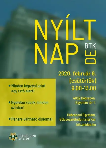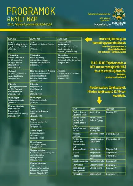 2020. 01. 27., h – 15:30 Nyílt nap a BTK-n A Debreceni Egyetem Bölcsészettudományi Kara nyílt napot tart a képzéseiről 2020. február 6-án. A program és a plakát normál nézetben: Program Plakát Legutóbbi frissítés: 2023. 09. 20. 09:40